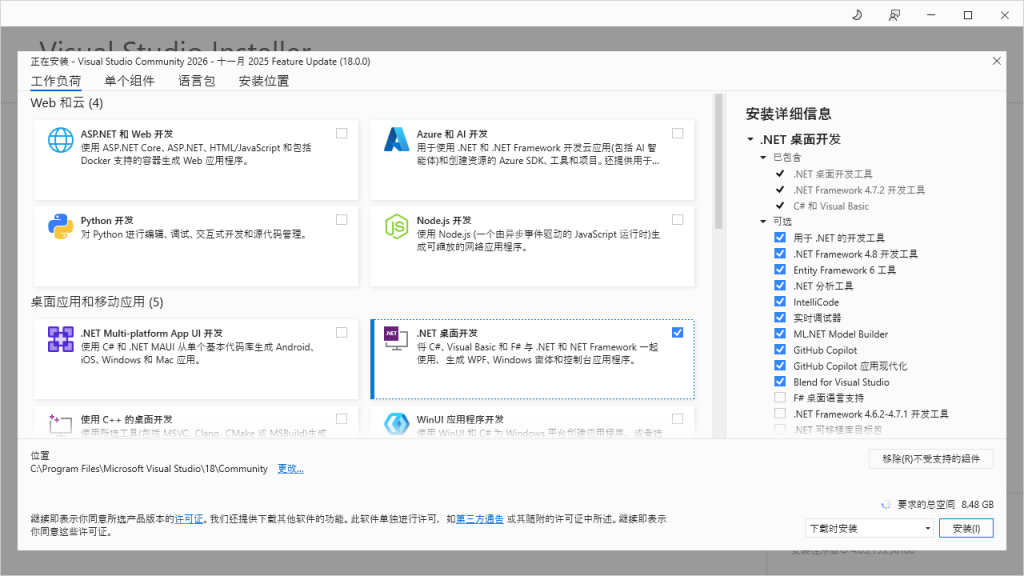 - 在【工作负荷】中,选择【桌面应用和移动应用】组中的【.NET 桌面开发】