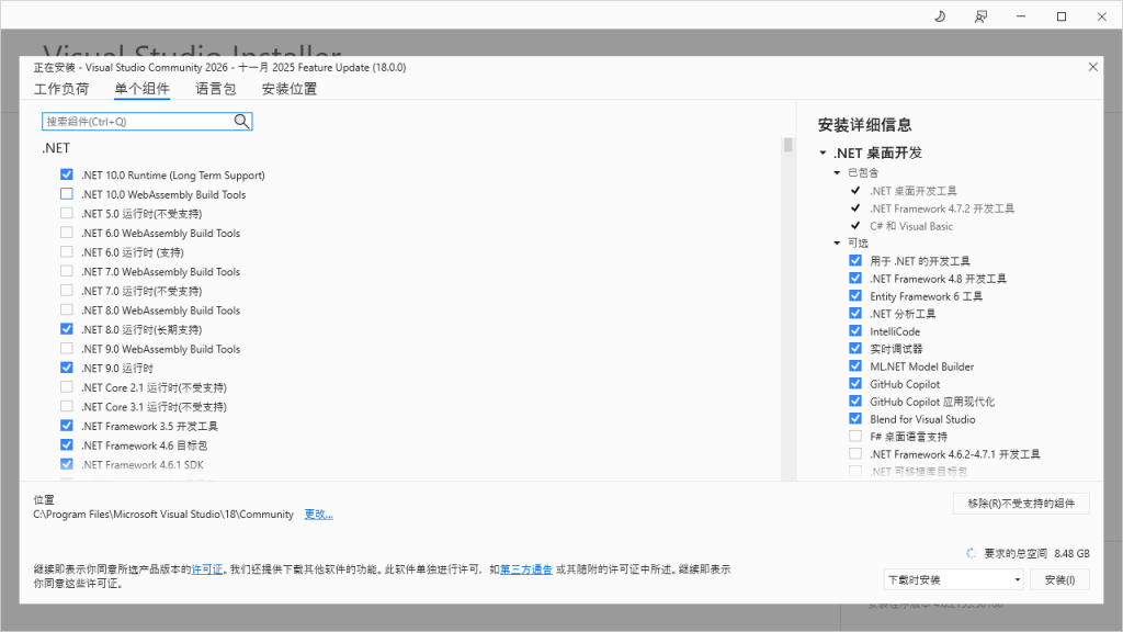 - 在【单个组件】中,根据需要勾选.NET 组件。