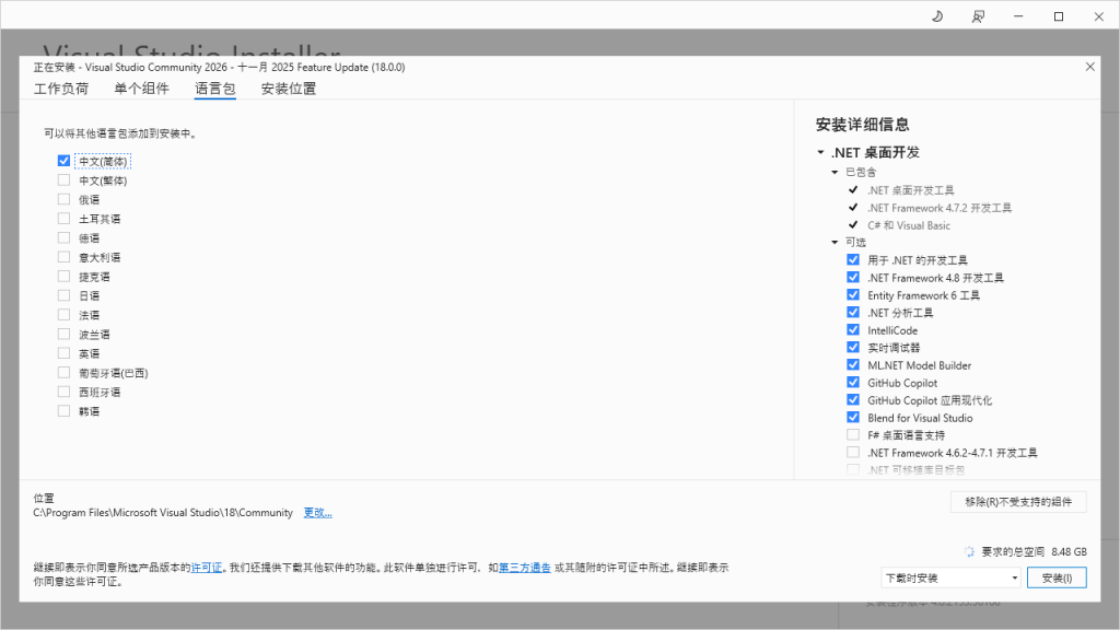 - 当前 Installer 则执行 Visual Studio 的安装。