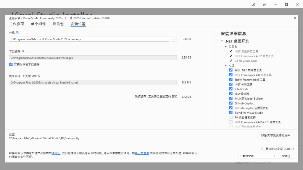 - 选择【安装位置】根据自己的实际情况来修改 Visual Studio 的安装位置。笔者这里默认安装到 C 盘,不作任何修改。
