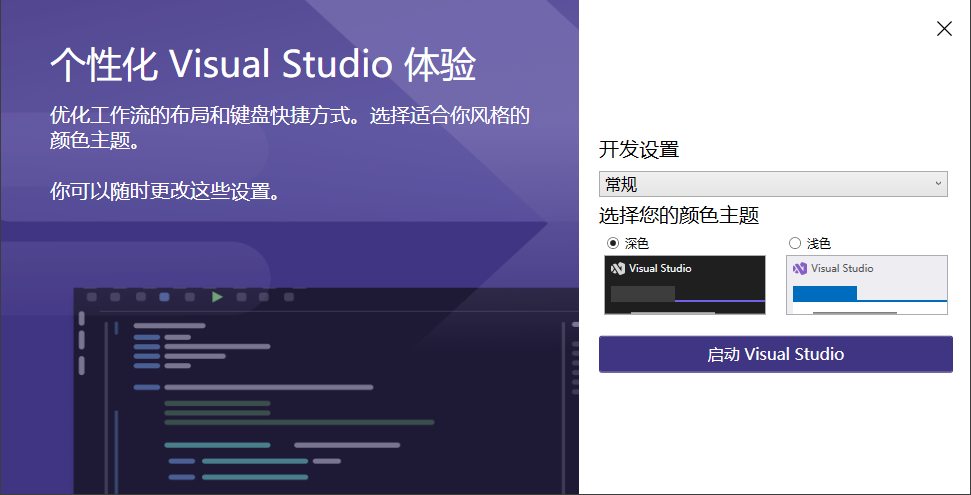 - 配置开发设置,以及颜色主题后,然后单击【启动 Visual Studio]