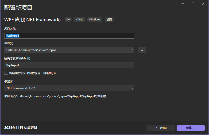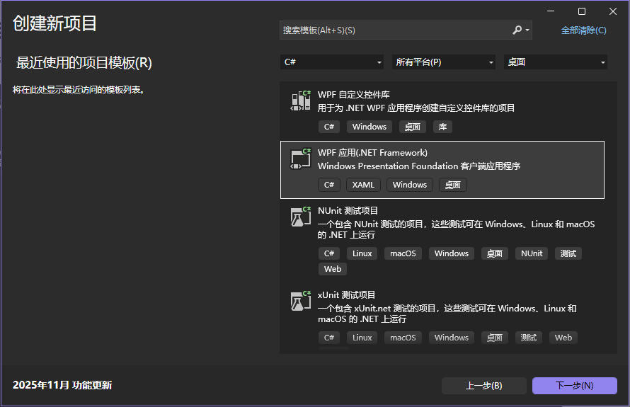 - 在创建新项目中,选择语言,平台,以及开发的程序集类型。如下图,我们再选择 WPF 应用(.NET Framework)模板。