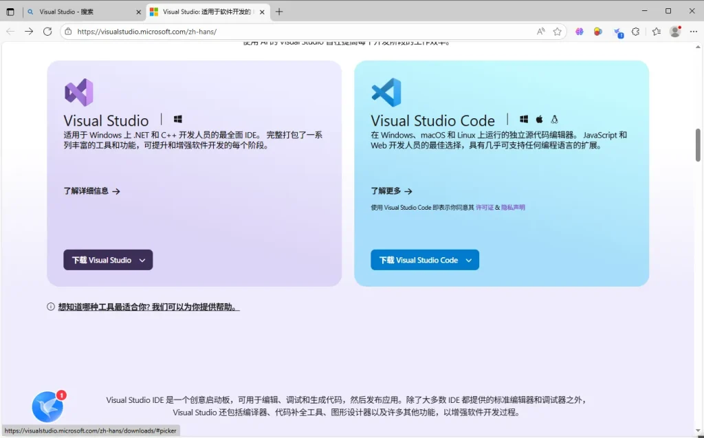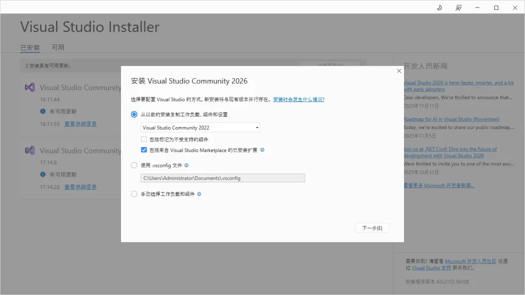 - 如果计算机已经安装了 Visual Studio Community 2022 等版本,则会斑马斑马与现有版本并存的提示。单击【下一步】。